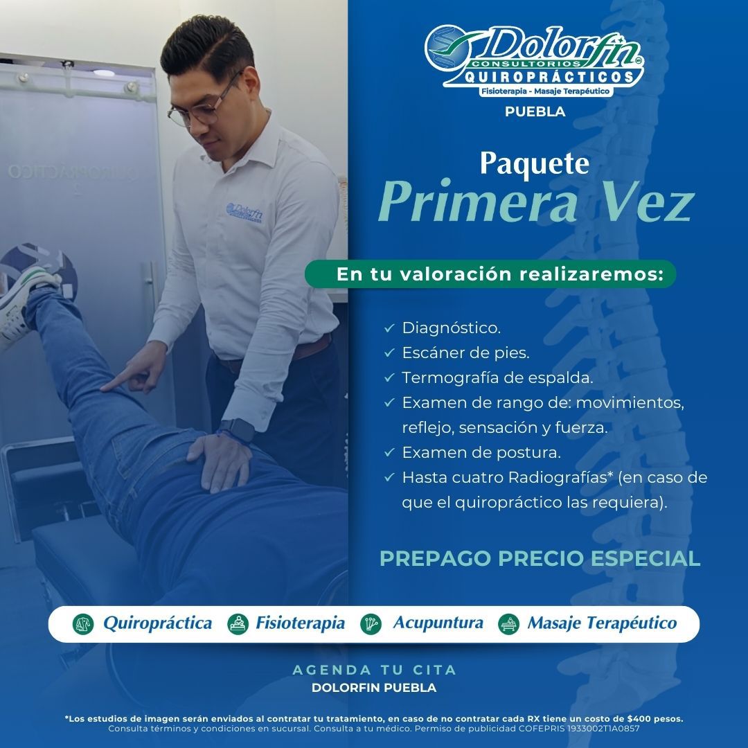 En Dolorfin Quiropráctico Puebla contamos con la solución a finalizar tu dolor y sentirte bien y subir tu sistema inmunológico. Hemos reservado un examen de 90 minutos, que incluye: